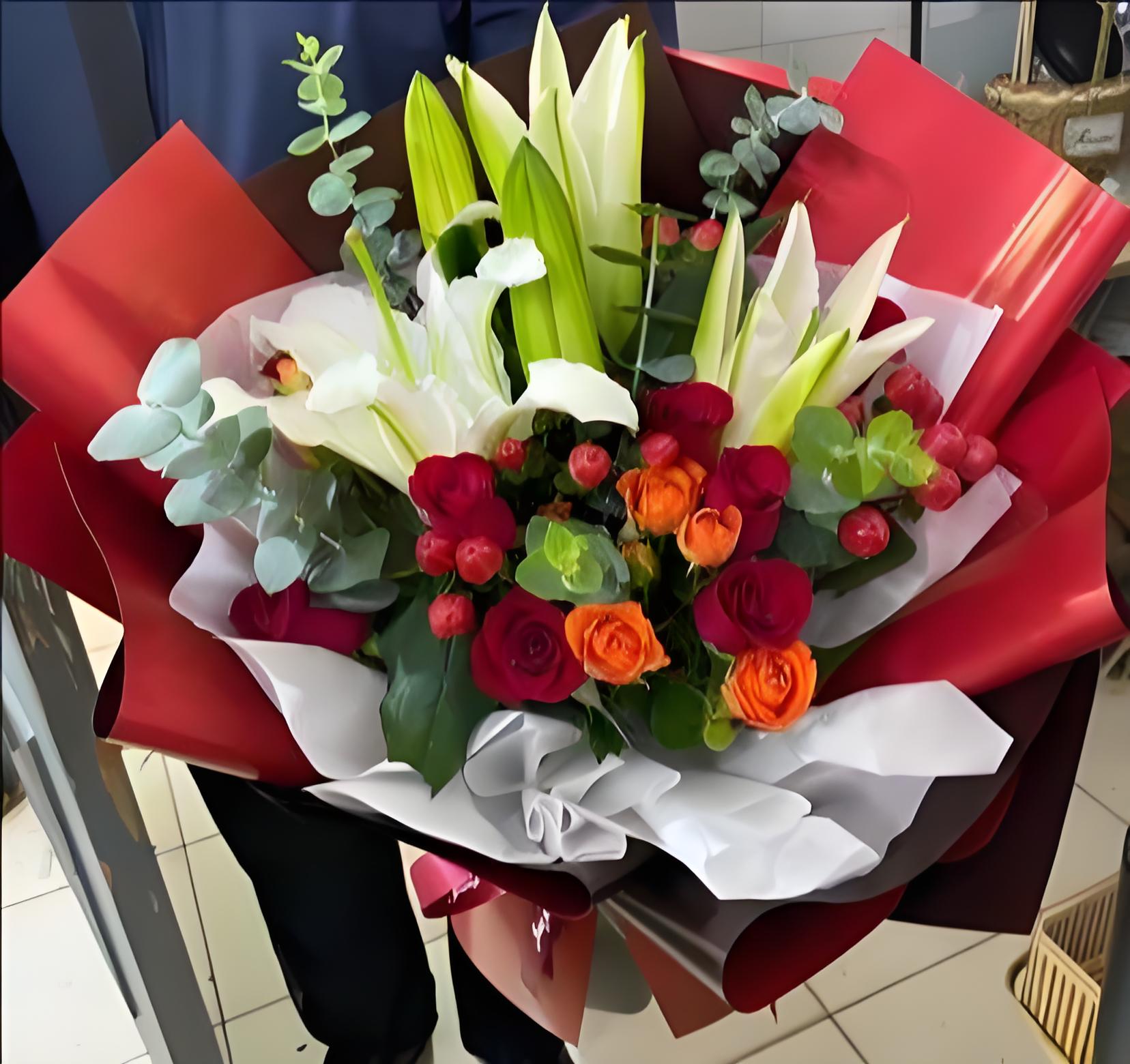 孝感花店包11枝红玫瑰、2枝多头白百合、6枝橙色多头玫瑰、红豆、尤加利叶